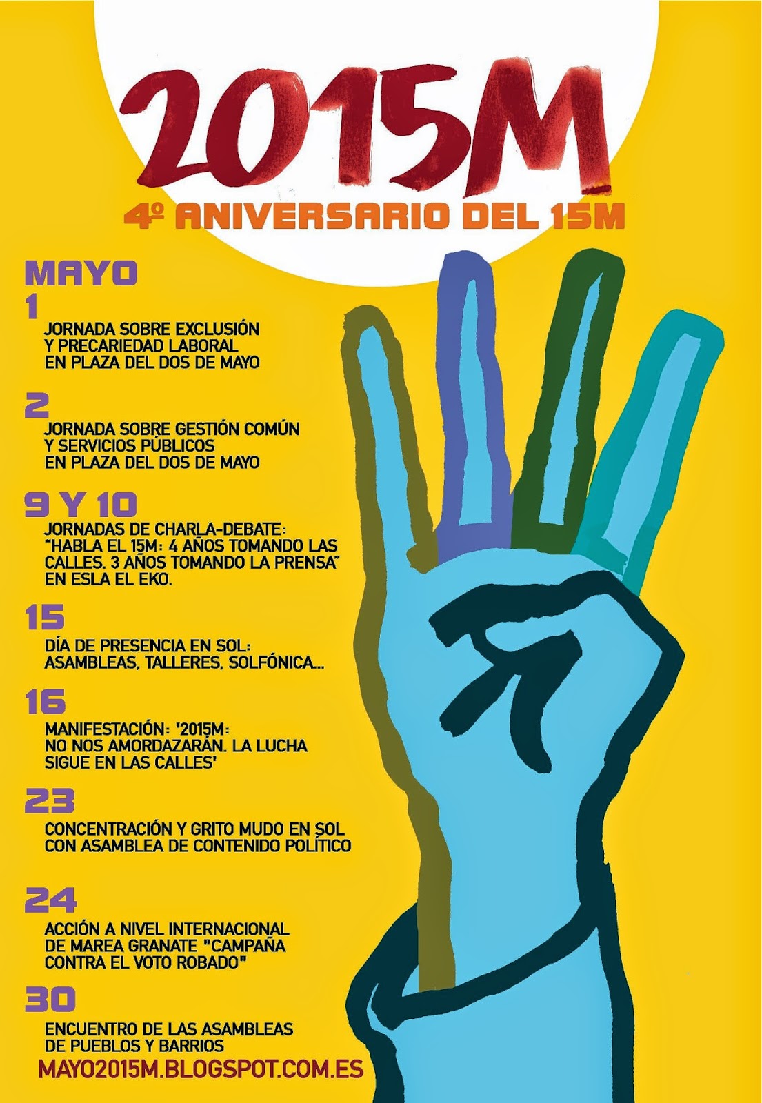 Varios colectivos vinculados al movimiento 15M están difundiendo una convocatoria para concentrarse en Sol el 23 de mayo, coincidiendo con la jornada de reflexión de las elecciones autonómicas y municipales. Es el cuarto aniversario de aquella acampada multitudinaria indefinida que supuso un punto de inflexión en la percepción de la política española y quieren celebrarlo.